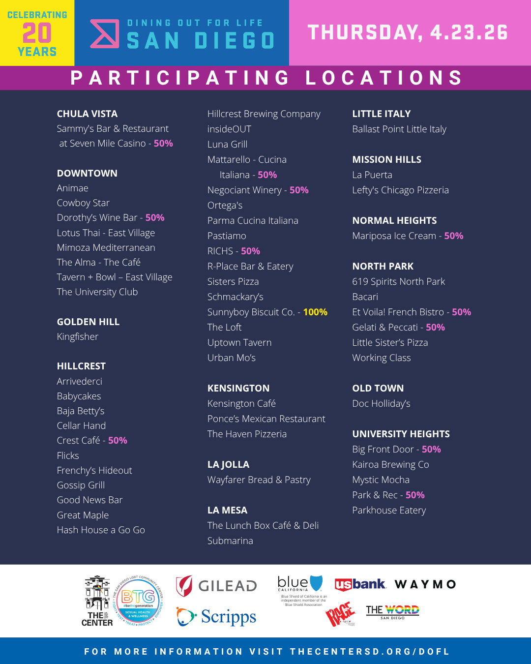 Dining Out For Life® San Diego is here this week and we are excited to be celebrating 20 years of this community fundraiser! On Thursday, April 23, thousands of people across San Diego County will Dine Out and Give Back as over 60 restaurants, bars, and cafés donate a portion of their sales to support health and wellness services at The Center, including HIV/AIDS services and prevention programs. I invite you to view the full list of participating locations, and make your dining plans today!