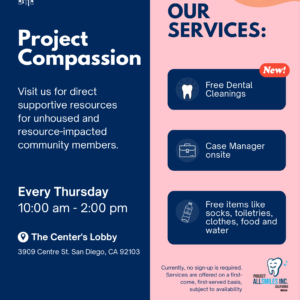 Join us for Community Mondays and Fridays at the South Bay Youth Center! This is a day for programs, events, tours, and community! When: Mondays and Fridays, 12-7pm Where: 1180 3rd Ave., Chula Vista, CA 91911 Contact: Email SouthBayYouth@thecentersd.org or call 619.800.3203 South Bay Youth Center services include: Safe & Affirming LGBTQI+ space, support groups, […] ...
