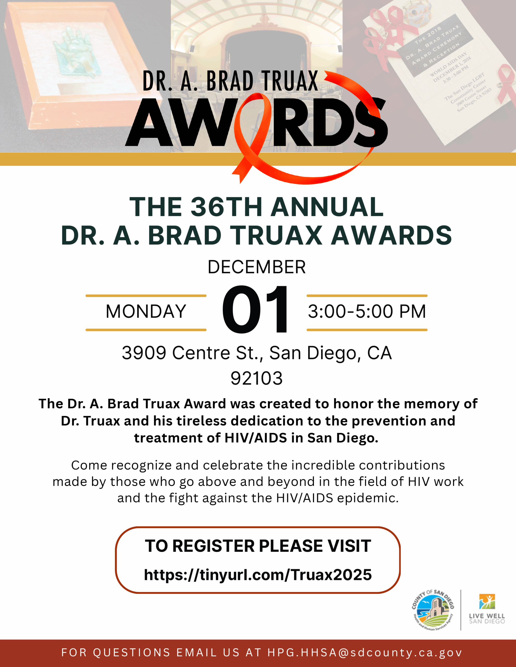 The Dr. A. Brad Truax Awards was created to honor the memory of Dr. Truax and his tireless dedication to the prevention and treatment of HIV/AIDS in San Diego.