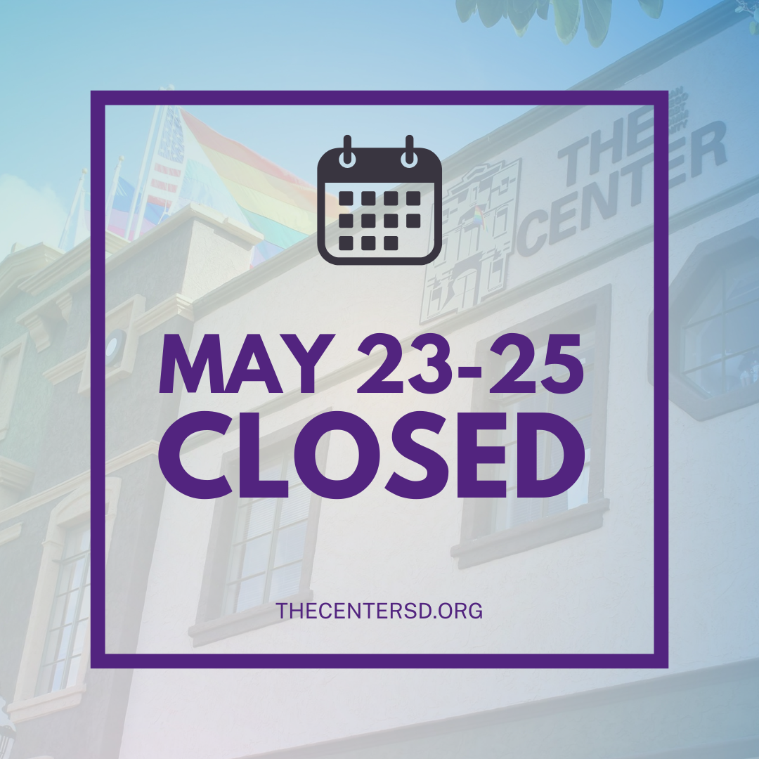 The Center’s main building, Hillcrest Youth Center, South Bay Youth Center, and Behavioral Health Services locations will be closed from May 23 to May 25, 2026. We will resume operations on Tuesday, May 26, 2026.