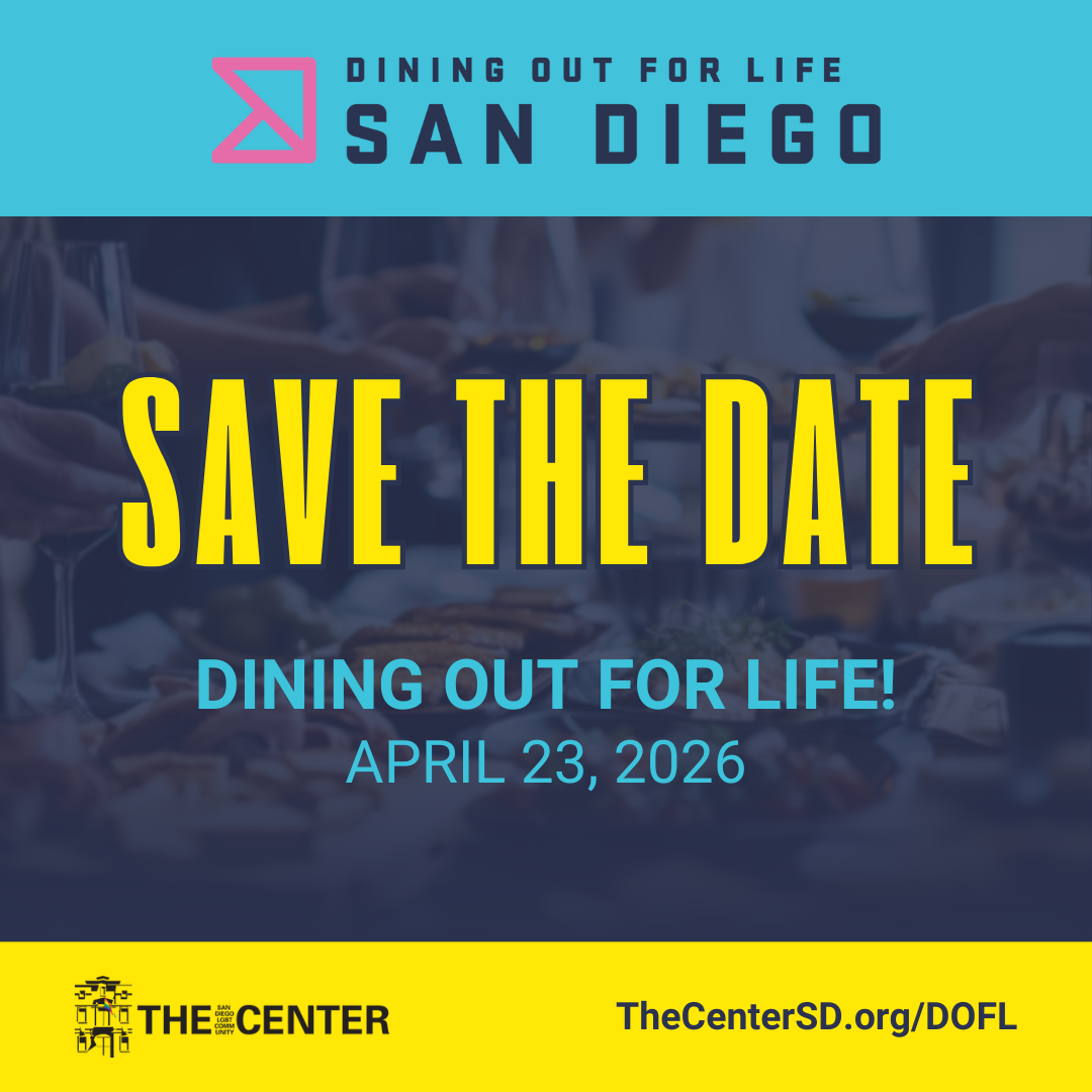 Grab your family and friends and make plans to Dine Out and Give Back for breakfast, lunch, dinner, coffee, cocktails and more. Are you interested in participating as a Dining Out For Life location? Click here for additional information about signing up to become a location for Dining Out for Life® San Diego. For more information, call Jen Haase at 619-880-0177 or email events@thecentersd.org.
