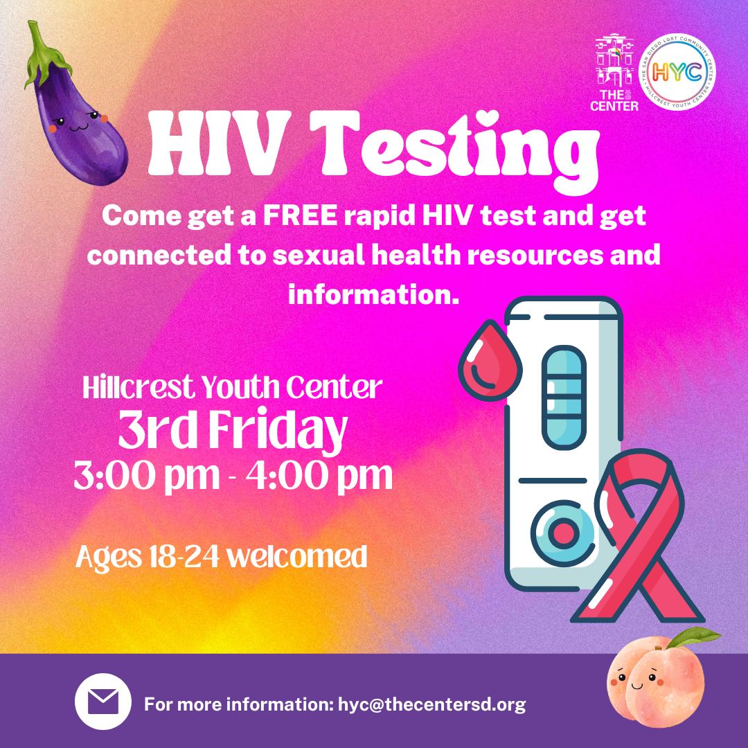 Sexual health and wellness is self care! Youth ages 18-24 are welcome to get a free HIV Test at Hillcrest Youth Center. All participants are eligible for a $20 gift card while supplies last. We administer rapid HIV tests which are the most accurate at 3 months post infection.