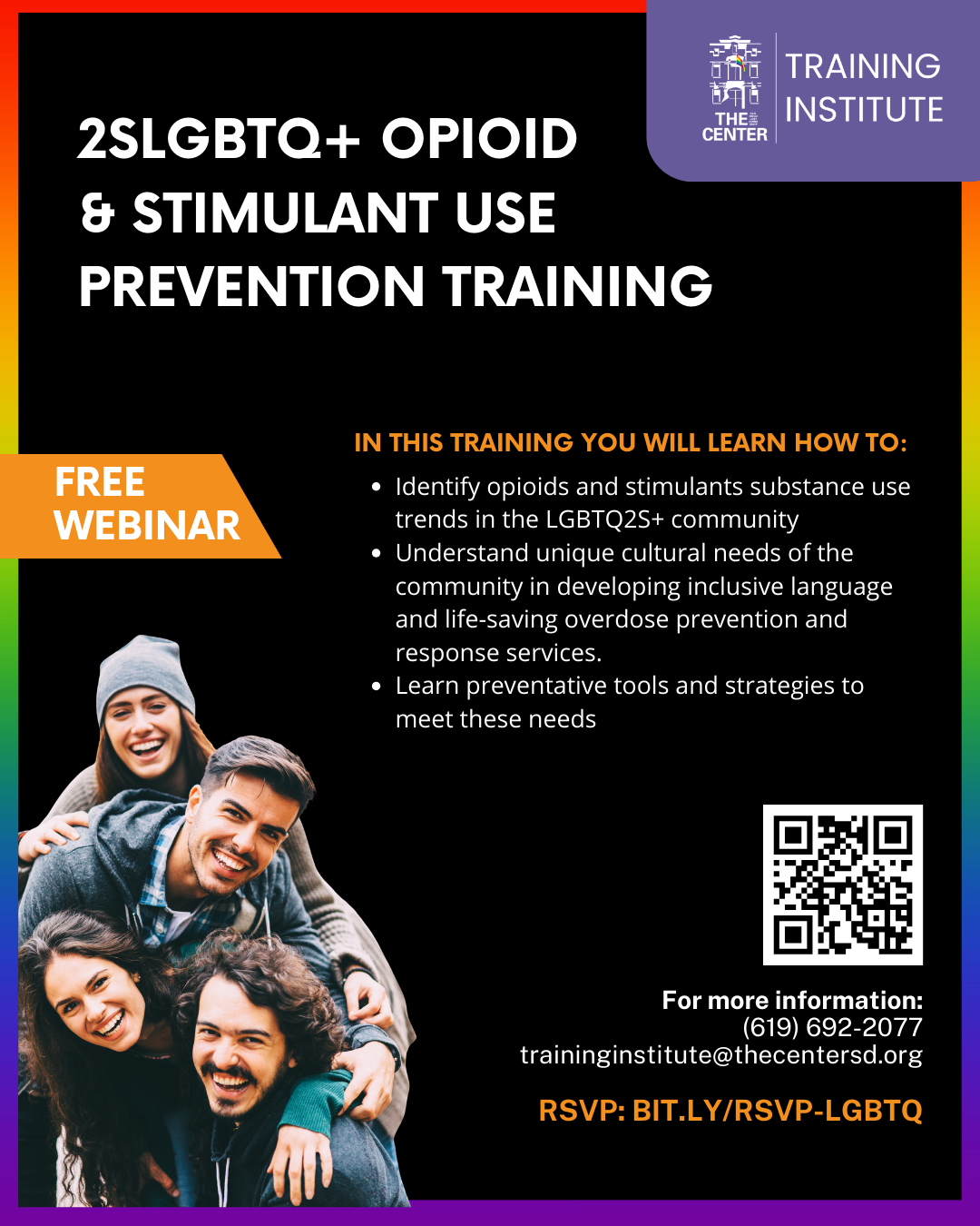 The Training Institute at The Center invites you to register for our free webinar 2SLGBTQ+ Opioid and Stimulant Use training. In this training you will learn how to: