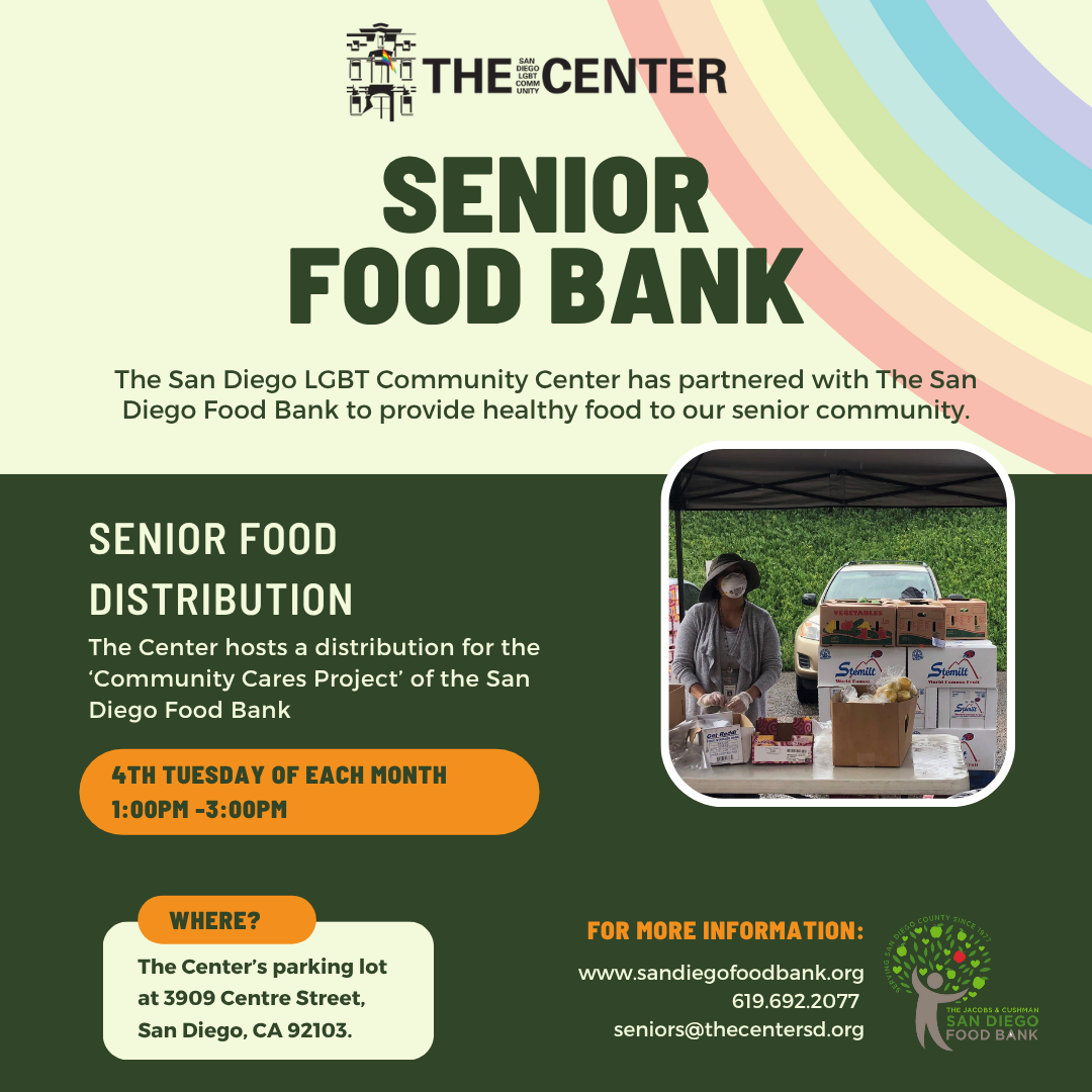 The Center’s Senior Food Bank, held in partnership with Jacobs & Cushman San Diego Food Bank, is free and open to low-income seniors 60 and older.