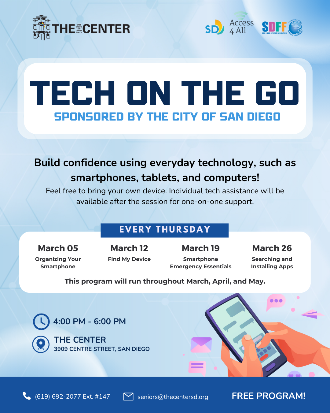 Tech on the Go is a partnership between the City of San Diego and the San Diego Futures Foundation that brings hands-on digital literacy classes directly into community spaces. These classes are designed to help participants build confidence using everyday technology, such as smartphones, tablets, and computers.