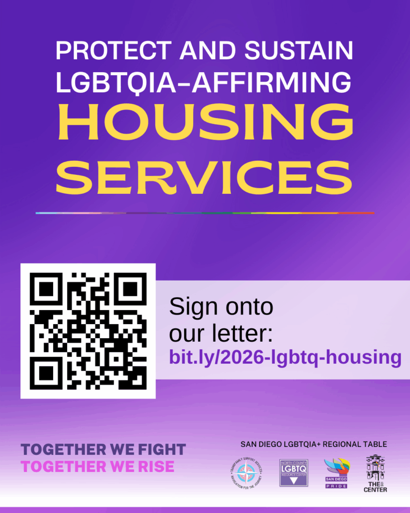 Join TransFamily Support Services, San Diego Pride, North County LGBTQ Resource Center, and The San Diego LGBT Community Center in urging the SD Board of Supervisors to sustain funding for housing services and the Immigrant Legal Defense Program, which provide vital support for LGBTQIA+ people in San Diego County.