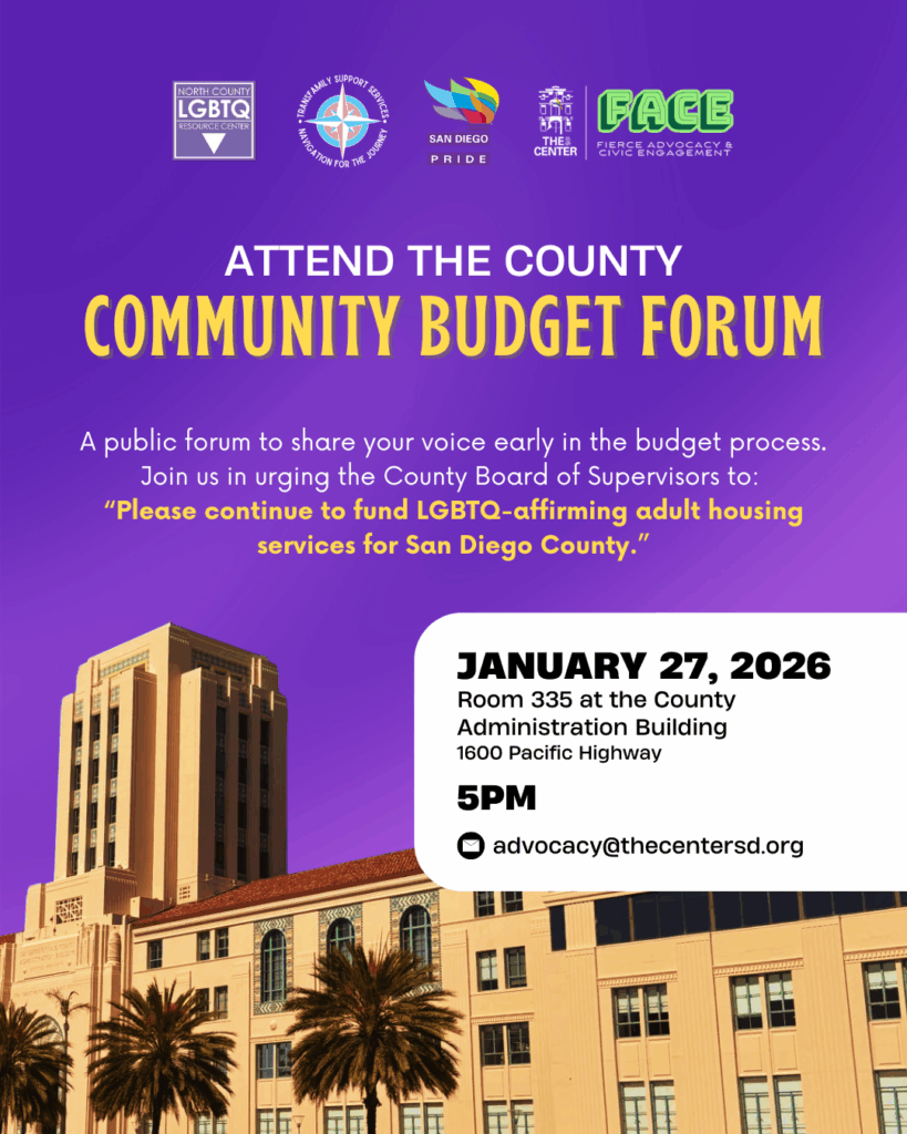 Take Action – Join us in urging the SD Board of Supervisors to sustain funding for housing services and the Immigrant Legal Defense Program, which provide vital support for LGBTQIA+ people in San Diego County.